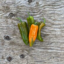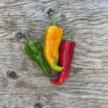 Green, Red, and Orange thin walled peppers, approx 4-6″ in length. Great enjoyed fresh, fried or baked – excellent sweetness. Basket of 3-5 based on size.